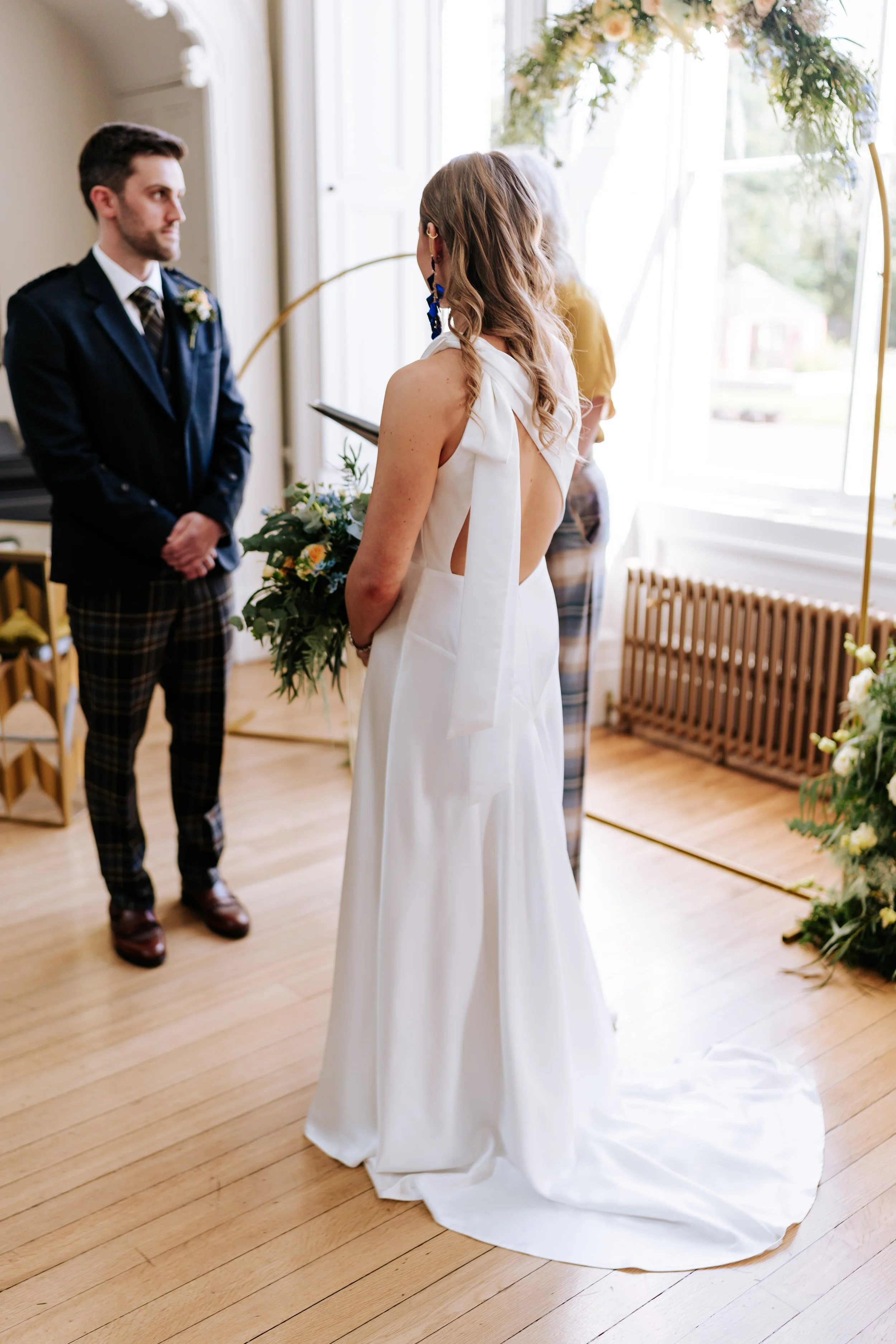 One of the most refreshing aspects of this wedding was the couple’s decision to not bother with the tradition of not seeing each other on the morning of the wedding. Right from the start, it set the tone for a day that was all about togetherness and authenticity. K + M were both getting ready in the intimate and beautifully designed rooms of Netherbyres House but would pass in and out to each other to chat and get things collected and ready meaning they were able to share moments of calm before the celebration. It was such a relaxed morning as they helped each other with those final touches. It was a beautiful reminder that your wedding day is about the two of you—your partnership, your story.